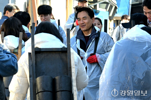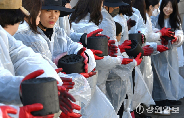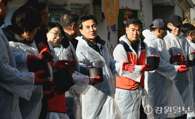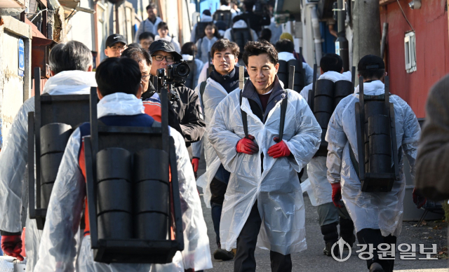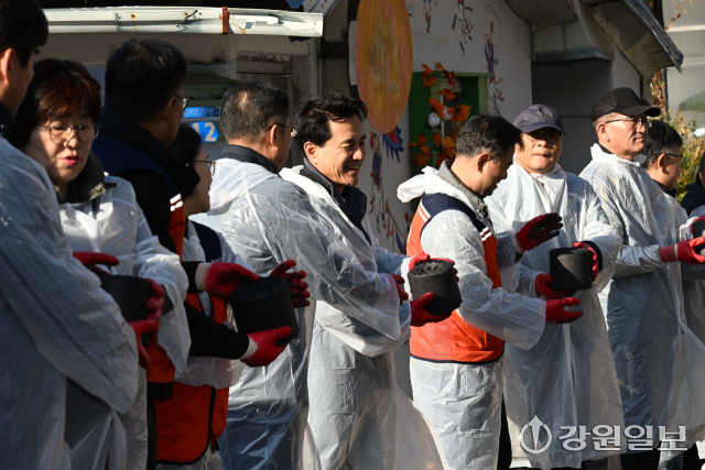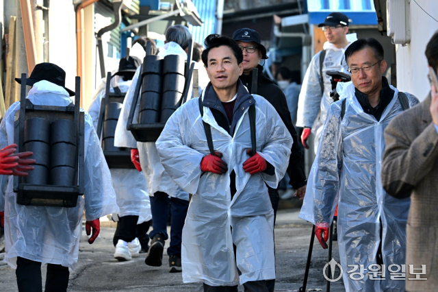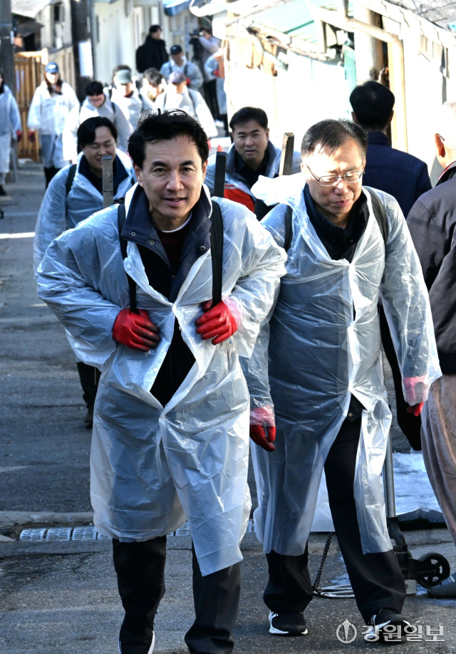 김진태 강원특별자치도지사를 비롯한 도청직원 및 가족들이 22일 춘천시 효자동 주택가에서 연탄배달 봉사를 하고 있다.