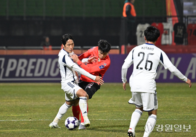 25일 춘천 송암스포츠타운에서 열린 2025-2026 ACLE리그 스테이지 5차전 강원FC와 마치다 젤비아의 경기.강원의 신민하가 수비하고 있다. 신세희기자