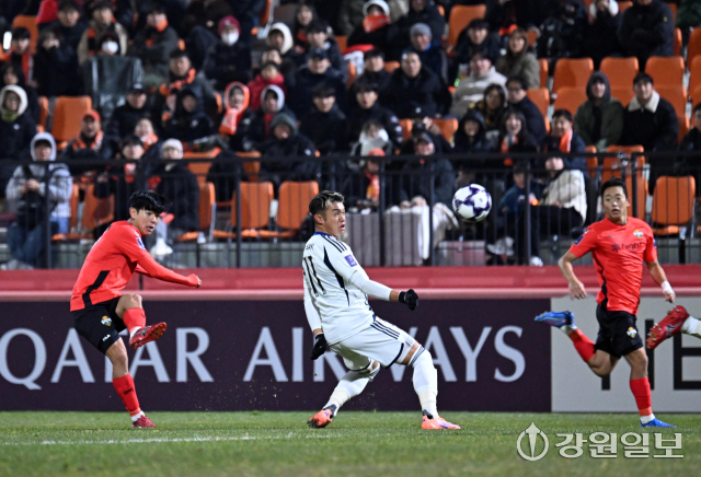 25일 춘천 송암스포츠타운에서 열린 2025-2026 ACLE리그 스테이지 5차전 강원FC와 마치다 젤비아의 경기. 강원의 김대원이 슈팅하고 있다. 신세희기자