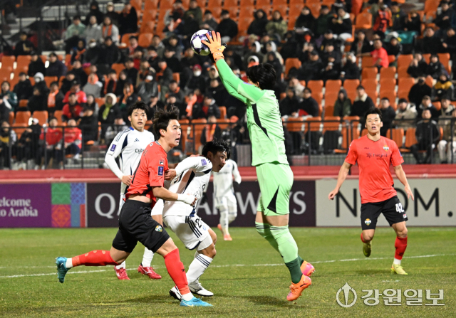 25일 춘천 송암스포츠타운에서 열린 2025-2026 ACLE리그 스테이지 5차전 강원FC와 마치다 젤비아의 경기. 강원의 공격이 마치다 젤비아의 골키퍼 타니에 막히고 있다. 신세희기자