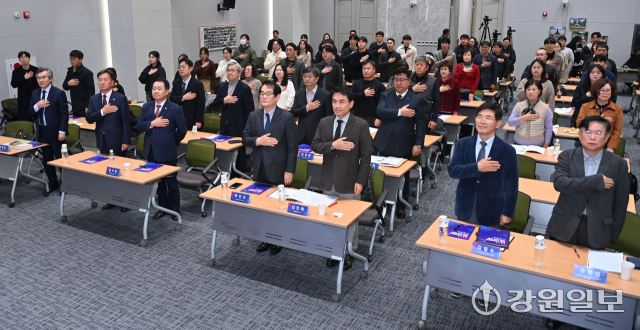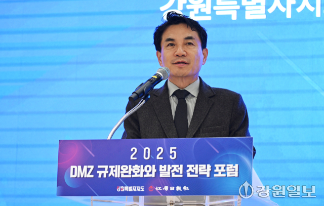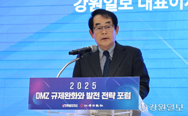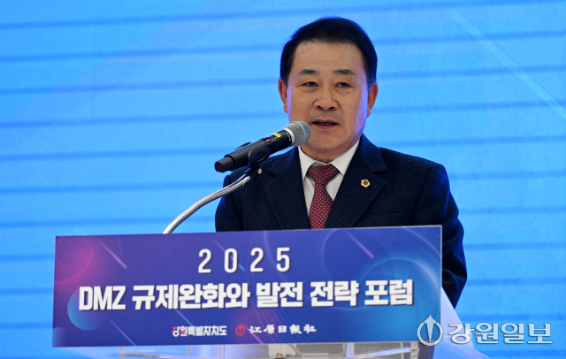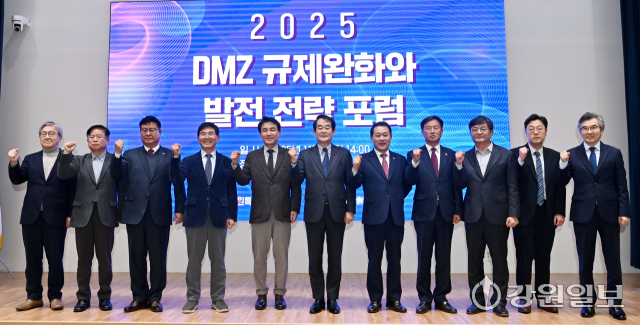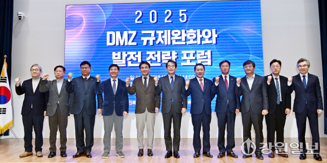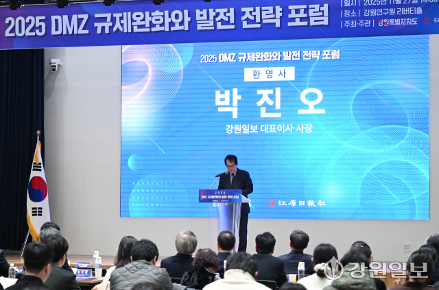 '2025 DMZ 규제완화와 발전 전략 포럼'이 27일 강원연구원에서 김진태 강원자치도지사, 김시성 도의장, 박진오 강원일보사장, 김왕규 도의원 등이 참석한 가운데 열렸다. 이날 포럼에선 김열수 한국군사문제연구원 안보전략실장이 '김정은의 대남 정책과 이재명 정부의 대북정책:원심력과 구심력'을 주제로 기조강연 이후 김창환 강원대 지리교육학과 교수가 '접경지역 규제완화와 지역발전의 실천적 전략'을 주제로 발표를 가졌다. 이후 규제완화 이후 접경지역 변화와 전략 등에 대해 종합토론이 이뤄졌다.