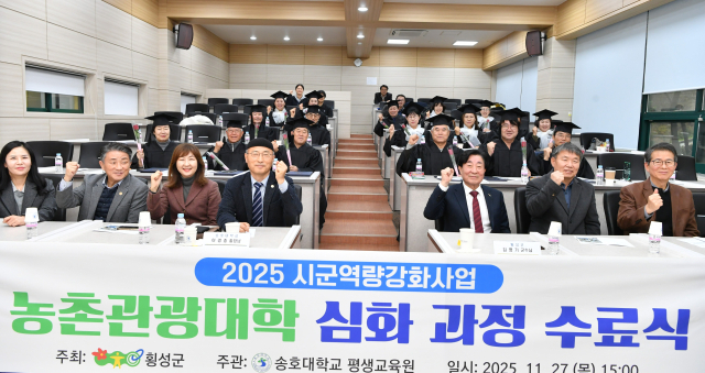 ◇2025 시군역량강화사업 일환으로 진행된 횡성군 농촌관광대학 심화과정 수료식이 27일 송호대 평생교육원에서 김명기 횡성군수, 이경중 송호대 총장, 수료생 등이 참석한 가운데 열렸다.