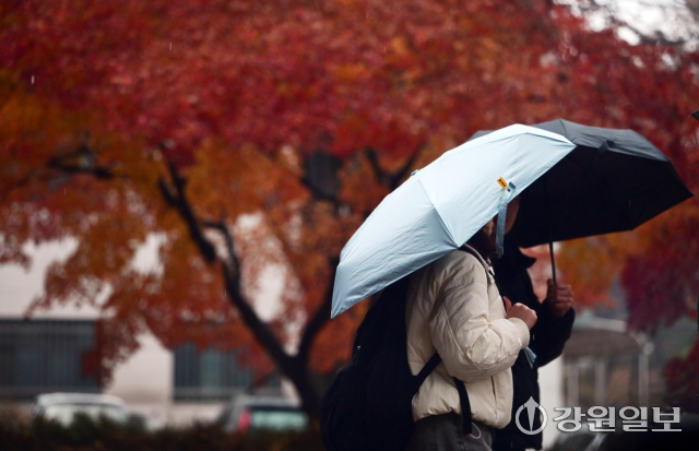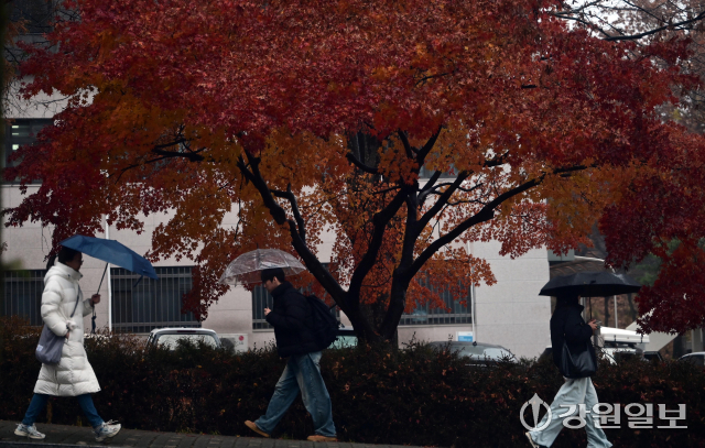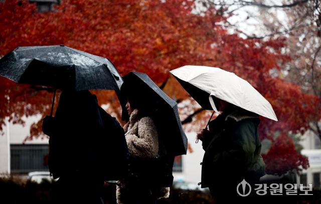 겨울을 부르는 비가 내린 27일 강원대 춘천캠퍼스에서 두꺼운 옷을 입은 학생들이 우산을 쓴 채 강의실로 향하고 있다. 신세희기자