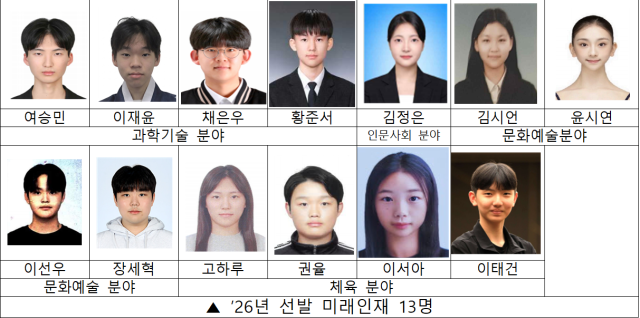 △과학기술 분야 여승민(고려대 인공지능 1년), 이재윤(민사고 2년), 채은우(강원과고 3년), 황준서(원주삼육중 3년) △인문사회 분야 김정은(원주금융회계고 3년) △문화예술 분야 김시언(예원학교 2년), 윤시연(선화예중 3년), 이선우(선화예고 2년), 장세혁(한예종 성악 1년) △체육 분야 고하루(강원체고 2년), 권율(근덕중 3년), 이서아(봉의고 2년), 이태건(강원체중 2년) 학생 등이다.