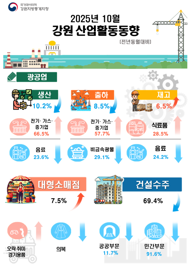 한편 상승세로 전환됐던 도내 광공업 생산은 지난해보다 10.2% 감소하며 한달 만에 마이너스를 나타냈다. 건설수주액은 전년동월대비 69.4% 감소하는 등 위축 기조를 이어갔다.