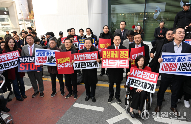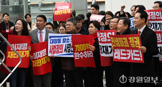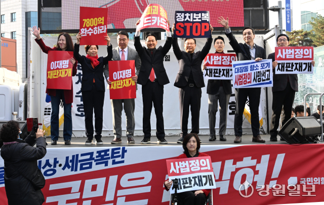 국민의힘이 30일 춘천시청 앞에서 장동혁 대표와 주요 당직자, 강원지역 의원 등이 참석한 가운데 '민생회복 법치수호 강원 국민대회'를 개최했다. 장 대표를 비롯한 참석자들이 이재명 정부를 비판하는 메시지가 적힌 손팻말을 들고 있다. 박승선기자