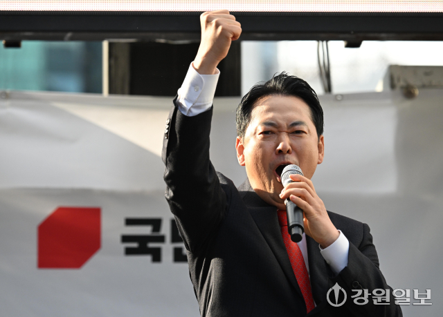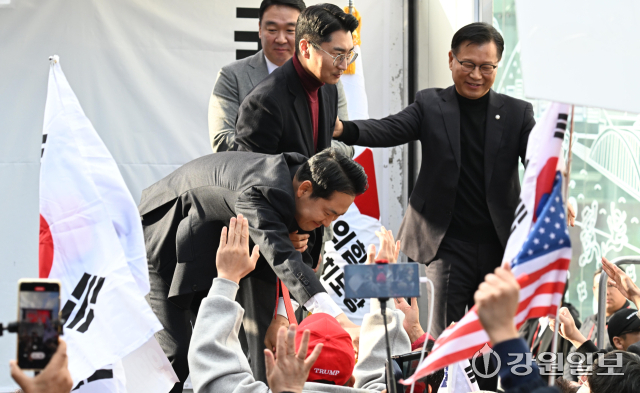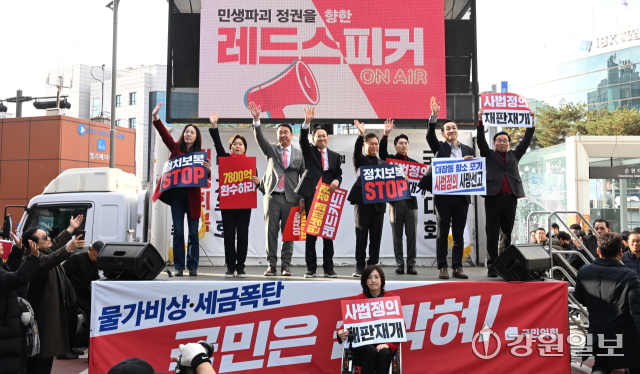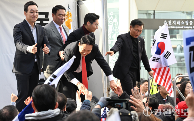 국민의힘이 30일 춘천시청 앞에서 장동혁 대표와 주요 당직자, 강원지역 의원 등이 참석한 가운데 '민생회복 법치수호 강원 국민대회'를 개최했다. 장 대표를 비롯한 주요 당직자들이 연설을 마친 후 함께 무대에 올라 인사하고 있다. 박승선기자국민의힘이 30일 춘천시청 앞에서 장동혁 대표와 주요 당직자, 강원지역 의원 등이 참석한 가운데 '민생회복 법치수호 강원 국민대회'를 개최했다. 장 대표를 비롯한 주요 당직자들이 연설을 마친 후 함께 무대에 올라 인사하고 있다. 박승선기자국민의힘이 30일 춘천시청 앞에서 장동혁 대표와 주요 당직자, 강원지역 의원 등이 참석한 가운데 '민생회복 법치수호 강원 국민대회'를 개최했다. 장 대표를 비롯한 주요 당직자들이 연설을 마친 후 함께 무대에 올라 인사하고 있다. 박승선기자국민의힘이 30일 춘천시청 앞에서 장동혁 대표와 주요 당직자, 강원지역 의원 등이 참석한 가운데 '민생회복 법치수호 강원 국민대회'를 개최했다. 장 대표를 비롯한 참석자들이 이재명 정부를 비판하는 메시지가 적힌 손팻말을 들고 있다. 박승선기자