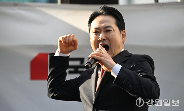 국민의힘이 30일 춘천시청 앞에서 장동혁 대표와 주요 당직자, 강원지역 의원 등이 참석한 가운데 '민생회복 법치수호 강원 국민대회'를 개최했다. 장 대표를 비롯한 참석자들이 이재명 정부를 비판하는 메시지가 적힌 손팻말을 들고 있다. 박승선기자30일 춘천시청 앞에서 열린 국민의힘 '민생회복 법치수호 강원 국민대회'에서 장동혁 대표가 연설하고 있다. 박승선기자