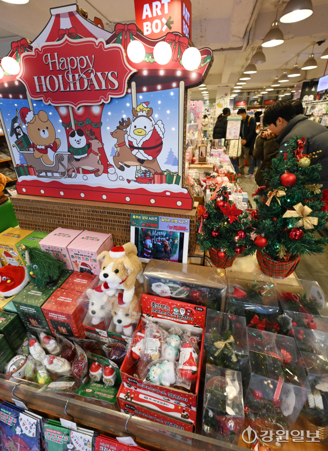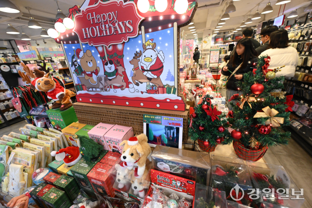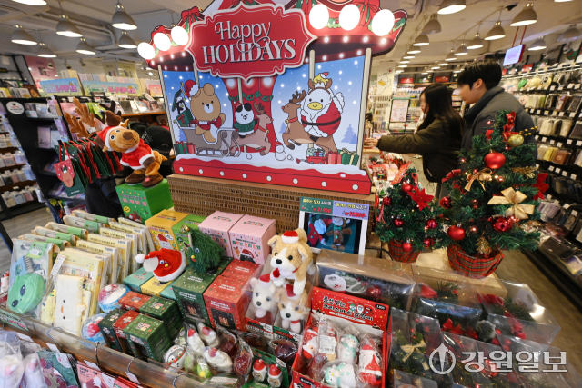연말연시가 다가온 가운데 30일 춘천의 한 팬시전문점에 일찌감치 크리스마스 장식과 선물이 진열돼 시민들의 눈길을 끌고 있다.