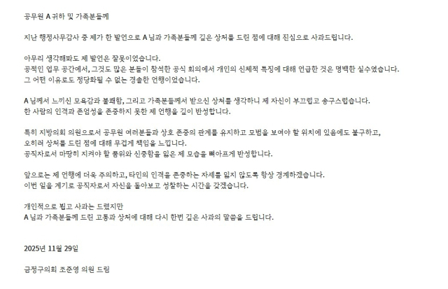 조 의원은 "지난 행정사무감사 중 제가 한 발언으로 A님과 가족께 깊은 상처를 드린 점에 대해 진심으로 사과드린다"면서 "공적인 업무 공간에서, 많은 분이 참석한 공식 회의에서 개인의 신체적 특징에 대해 언급한 것은 명백한 실수"라며 사과했다.