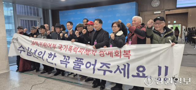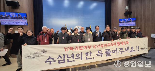 더불어민주당 허영(춘천갑) 국회의원이 2일 국회 소통관에서 기자회견을 열고 '납북귀환어부 인권침해사건 진상규명 및 피해자 명예회복에 관한 특별법' 대표 발의 취지를 설명했다. 납북귀환어부 피해자들은 이날 특별법의 조속한 통과를 요청했다.