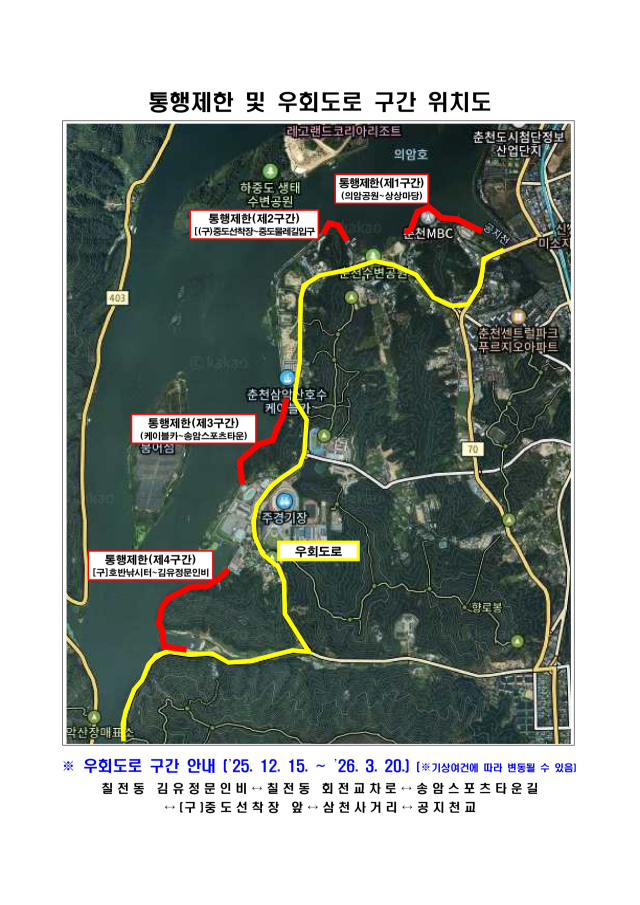 통제 도로 구간은 △신북읍 유포리~배후령정상(배후령옛길) △신북읍 지내리~사북면 고탄리(세미고개) △신동면 혈동1리~혈동2리 △사북면 원평리~신포1리 △오월고개~오월막국수 등이다.