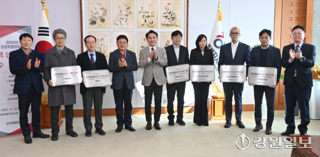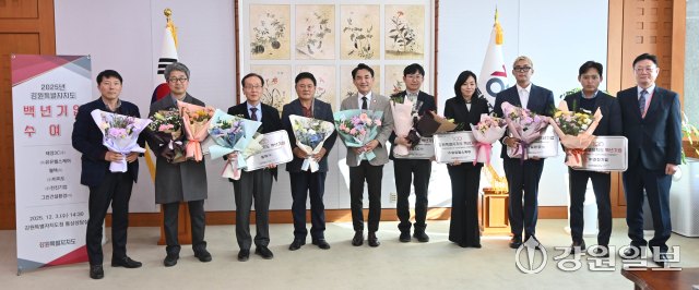 2025년 강원특별자치도 백년기업 수여식이 3일 도청 통상상담실에서 열렸다. 김진태 도지사와 전영철 백년기업회장, 백년기업 선정기업 대표 등이 수여식을 마친 후 함께 기념촬영을 하고 있다. 박승선기자2025년 강원특별자치도 백년기업 수여식이 3일 도청 통상상담실에서 열렸다. 김진태 도지사와 전영철 백년기업회장, 백년기업 선정기업 대표 등이 수여식을 마친 후 함께 기념촬영을 하고 있다. 박승선기자