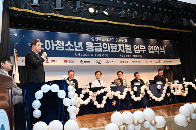 강원특별자치도와 강릉아산병원, 평창군을 포함한 9개 시·군이 함께하는 '영동권역 소아청소년 응급의료 지원' 업무협약식이 4일 강릉아산병원 강당에서 김진태 강원특별자치도지사, 심재국 평창군수, 유창식 강릉아산병원장을 비롯한 시·군 지자체장 및 관계자들이 참석한 가운데 열렸다.