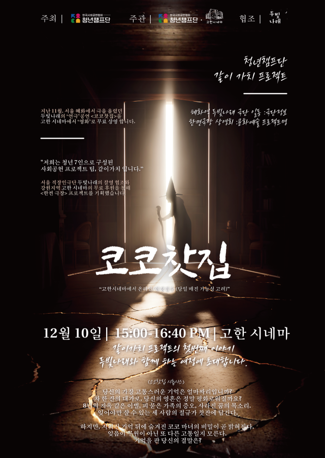 이번 한켠극장은 고한시네마와 청년챔프단이 행정안전부 산하 사단법인 한국사회공헌협회 청년챔프단 산하 문화예술 프로젝트 팀 ‘같이가치’, 서울 소극단 두빛나래와 함께 마련한 프로그램으로 정선군 주민의 문화 예술 향유 기회 확대를 위해 공동주관했다.