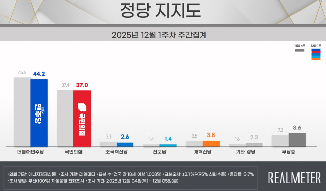 정당 지지도 조사에서는 더불어민주당이 44.2%, 국민의힘이 37.0%였다. 양 당은 각각 전주보다 1.4%포인트, 0.4%포인트씩 수치가 떨어졌다. 더불어민주당의 경우 최근 2주 연속 하락세를 그렸다. 특히 '1인 1표제' 부결로 인한 당내 리더십 타격 및 내홍 심화와 문진석-김남국 의원의 '인사 청탁' 논란 등이 불거지며 혼란을 초래한 것으로 파악됐다. 국민의힘은 장동혁 대표의 계엄 사과 거부 등 미온적 태도로 '계엄 사죄'를 요구한 당내 의원들과의 갈등 및 분열이 지지층 혼란을 초래하면서 지지율이 떨어진 것으로 분석됐다.