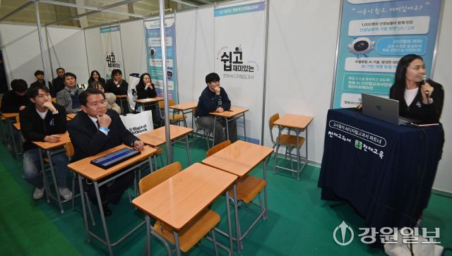 강원일보와 강원특별자치도교육청이 공동 주최하는 이번 박람회는 '교실에서 증명하다'를 주제로 교사가 주도하고 있는 디지털 수업 사례를 현장에서 직접 시연하고 공유하면서 실천적인 교육 문화를 조성하기 위해 준비됐다. 올해부터 도입된 AI디지털교과서의 확대와 함께 학교 현장에서 활용 가능한 AI코스웨어 학습 플랫폼이 소개된다. AI코스웨어는 인공지능 기술을 활용해 학습 콘텐츠를 제작하고 운영·관리하는 디지털 교육 시스템 전체를 말한다. 교과서 개념에서 더 나아가 AI가 학습자의 수준과 성과, 취향까지 분석해 맞춤형 학습 경로를 제공하는 지능형 학습 도구를 박람회장에서 만나 볼 수 있다. 40여개 업체들이 참가해 50여개 부스가 운영된다.
