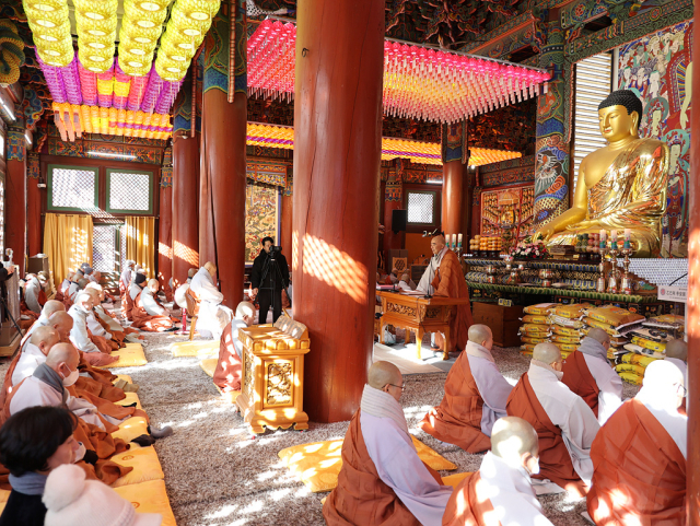 대한불교조계종 제4교구 본사인 월정사도 앞서 지난 3일 용상방(수행 소임표)을 짠 데 이어, 이날 경내 적광전에서 결제법회를 열고 치열한 용맹정진을 다짐했다. 퇴우 정념 스님은 법문에서 “만물이 잎과 꽃을 피우고 열매를 맺는 시기가 있다면, 동안거는 모든 잎과 열매가 뿌리로 돌아가는 시기”라며 “만상이 스스로를 비우고 열매를 떨궈야 혹독한 겨울을 지나 다시 봄에 꽃을 피울 수 있다”고 강조했다.