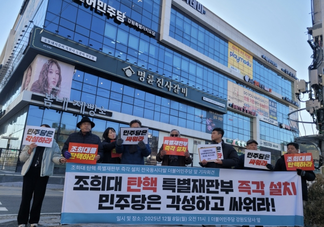 강원촛불행동은 8일 오전 더불어민주당 강원특별자치도당 앞에서 기자회견을 열고 “내란전담재판부 설치 특별법을 조속히 국회 본회의에서 통과시켜라”고 촉구했다.