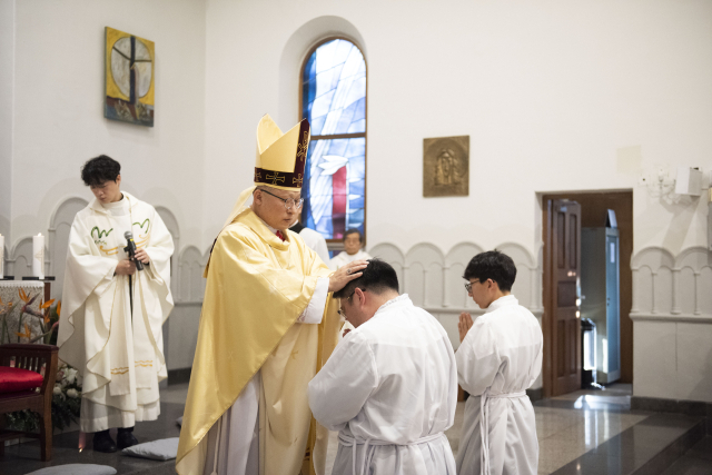 천주교 춘교구의 2025 부제 서품식이 9일 춘천 죽림동 주교좌성당에서 거행됐다. 이날 김주영 주교의 주례로 정환우 요셉(노암동), 정의빈 제라드(연봉) 신학생이 부제 서품을 받았다.