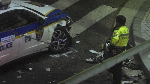 이 사고로 경찰관 2명이 다쳐 병원으로 옮겨졌고 순찰차 앞부분이 크게 파손됐다.