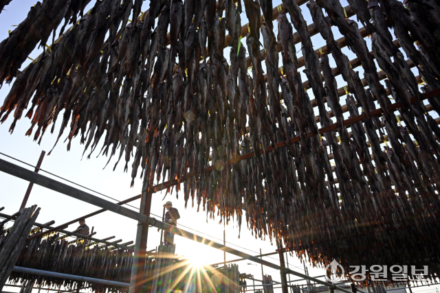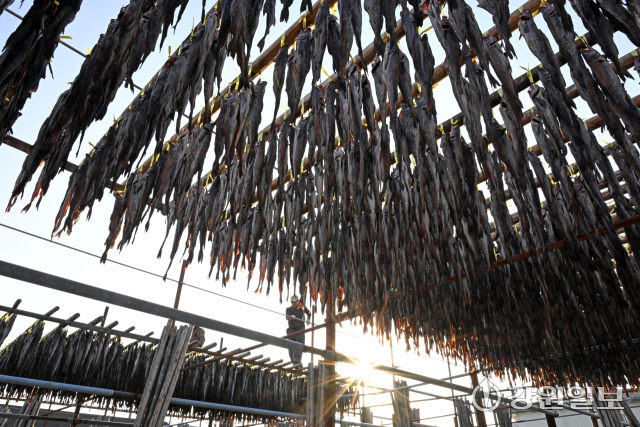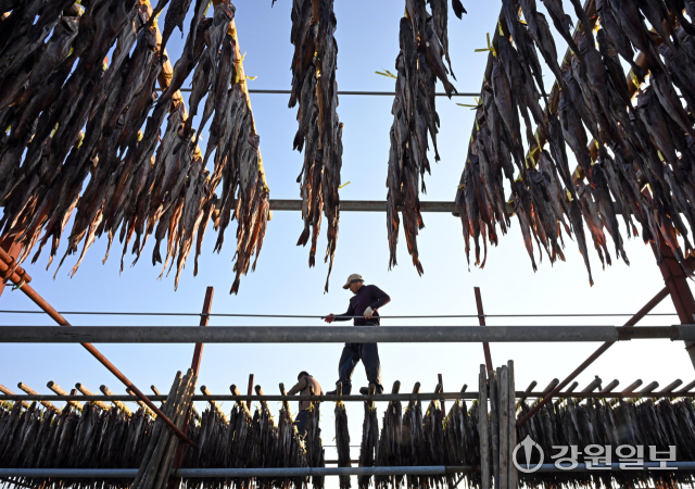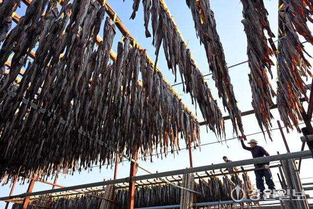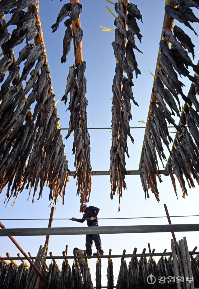 10일 동해 묵호덕장마을에서 주민들이 묵호태를 말리고 있다.