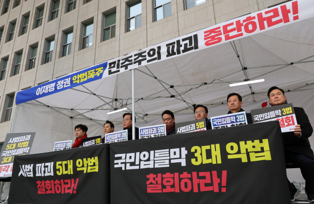 여야가 연말 국회에서 극한 대치를 이어가고 있다. 더불어민주당이 이른바 사법개혁 법안을 연내 마무리짓겠다는 목표로 강한 입법 드라이브를 걸자, 국민의힘은 필리버스터(무제한 토론을 통한 합법적인 의사진행 방해)와 함께 천막 농성으로 맞서며 여론전에 돌입했다. 여야 대치 속 민생 법안의 연내 처리도 어려워졌다.