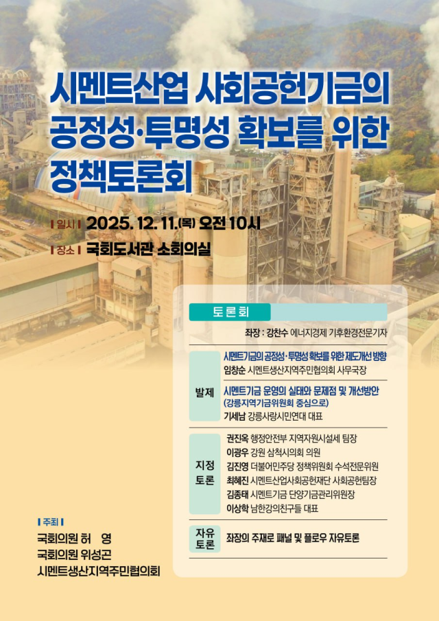 이날 임창순 시멘트생산지역주민협의회 사무국장이 '시멘트기금의 공정성·투명성 확보를 위한 제도개선 방향', 기세남 강릉사랑시민연대 대표가 '시멘트기금과 타 기금 간 운영방식 비교 분석'을 주제로 발제한다. 이어 김진영 민주당 정책위 수석전문위원, 이광우 삼척시의원, 이상학 남한강의친구들 대표, 권진옥 행정안전부 지역자원시설세 팀장, 최혜진 시멘트산업사회공헌재단 사회공헌팀장, 김종태 시멘트기금 단양기금관리위원장 등이 토론에 참여할 예정이다.