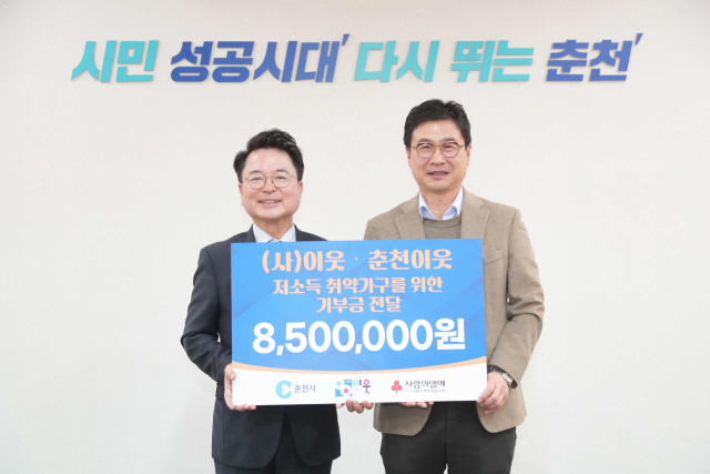 (사)춘천이웃(회장:김희두)은 11일 시청 접견실에서 육동한 시장에게 지역 저소득층을 위한 지원금 850만원을 전달했다.