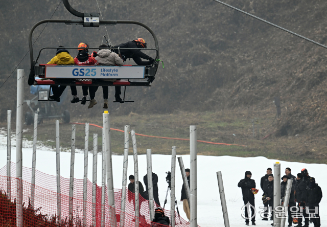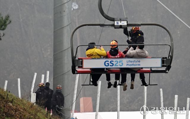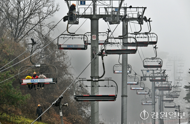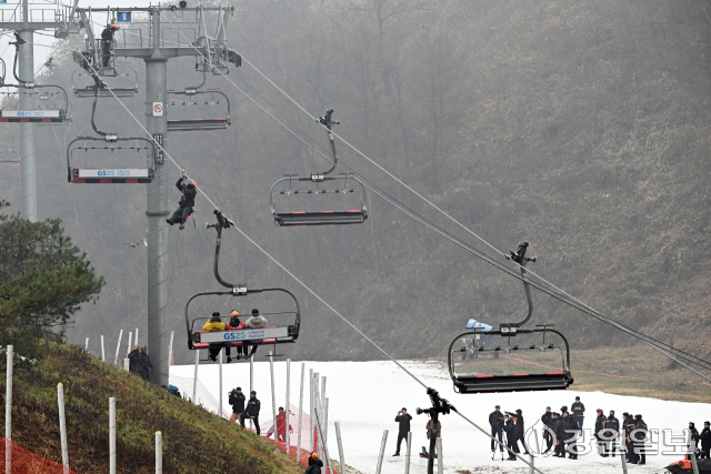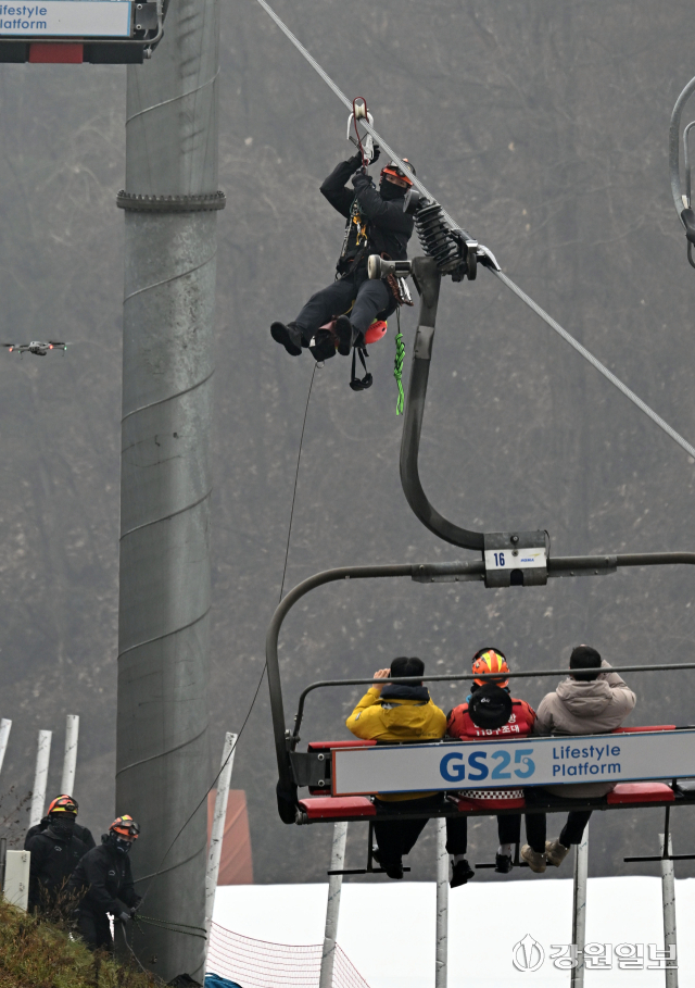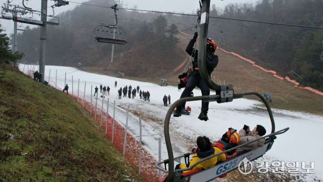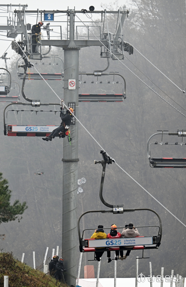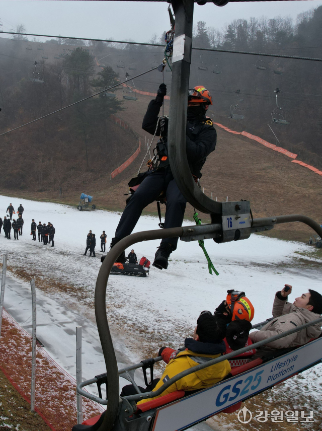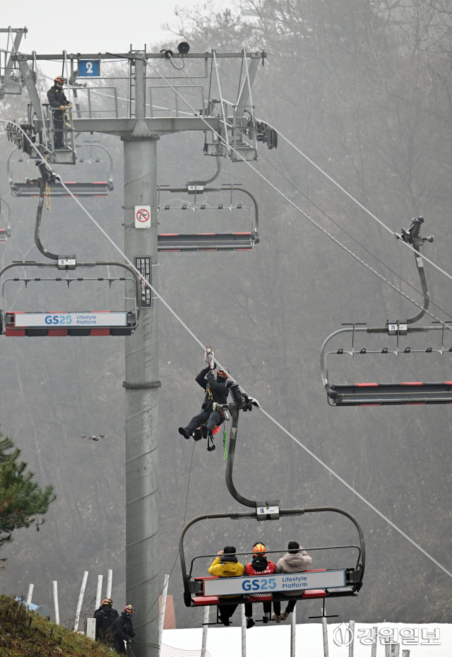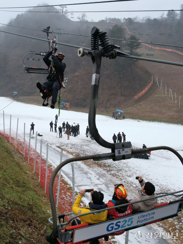 춘천소방서는 11일 춘천 엘리시안 강촌 스키장에서 겨울철 스키장 리프트 멈춤사고에 대비해 구조 훈련을 실시했다.