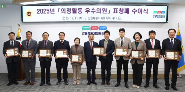 강원도의회는 11일 의회 세미나실에서 2025년 의정활동 우수의원 표창패 및 의원연구회 회장·간사 감사패 수여식을 개최했다. 우수의원 감사패는 그동안 모범적인 의정활동을 펼친 의원을 발굴·시상해 사기를 진작하고 도민을 위한 정책·입법 활동을 활성화하고자 마련됐다.