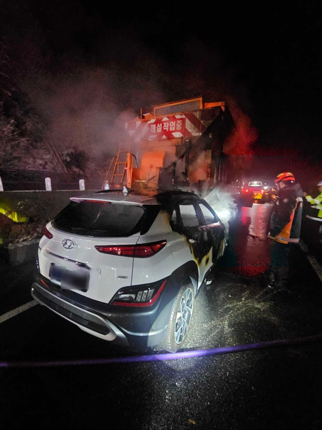 전국에 내린 눈이 밤새 얼어붙은 가운데 중앙고속도로에서 30대가 몰던 승용차가 제설차를 추돌한 후 화재가 발생했다.