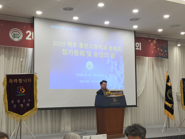 재춘홍천고등학교동문회(회장:허남진)는 지난 13일 세종호텔에서 육동한 춘천시장, 최성현 강원관광재단 대표, 신영길 재춘홍천군민회장, 최상순 홍천고 총동문회장 및 동문들이 참석한 가운데 '2025년도 정기총회 및 송년의 밤'을 개최했다.재춘홍천고등학교동문회(회장:허남진)는 지난 13일 세종호텔에서 육동한 춘천시장, 최성현 강원관광재단 대표, 신영길 재춘홍천군민회장, 최상순 홍천고 총동문회장 및 동문들이 참석한 가운데 '2025년도 정기총회 및 송년의 밤'을 개최했다.
