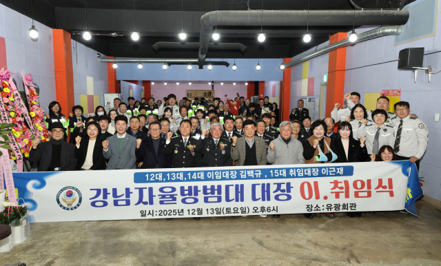 강남동 자율방범대장 이·취임식이 지난 13일 강릉시강남동 유광회관 지하에서 열려 김백규 회장이 이임하고 이근재 회장이 취임했다.