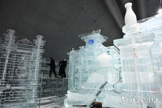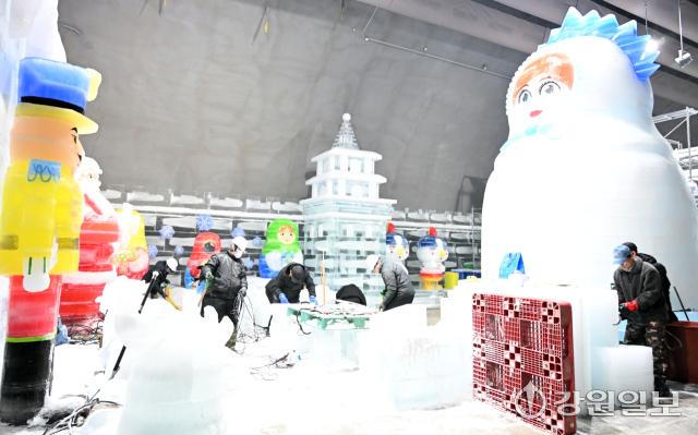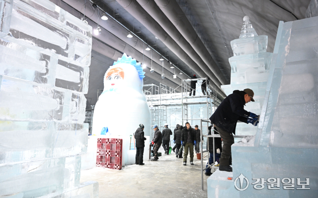 2026 화천산천어축제 시즌 시작을 기념하는 선등거리 점등식과 실내 얼음조각광장 개장식을 앞둔 15일 화천읍 서화산 다목적 광장에서 관계자들이 얼음조각을 다듬느라 분주하다.