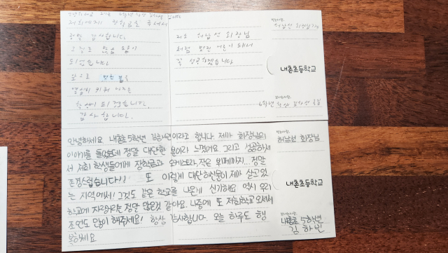 앞서 허남선 이사장은 지난해 내촌중·내촌초교 학생 전원에게 장학금을 수여하고 학교 발전기금을 기탁했다. 이번 손편지는 학생들이 감사의 마음을 잊지않고 1년 만에 전한 뜻깊은 소통이다.