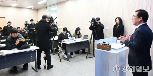 강삼영 전국교육자치혁신연대 상임대표가 16일 도교육청에서 기자회견을 열고 교육감 선거 출마를 선언하고 있다.