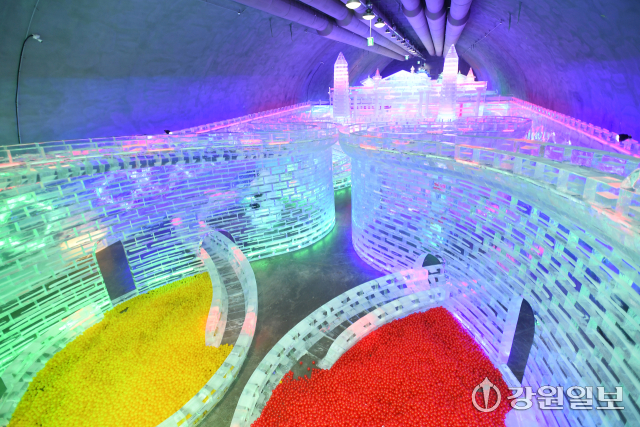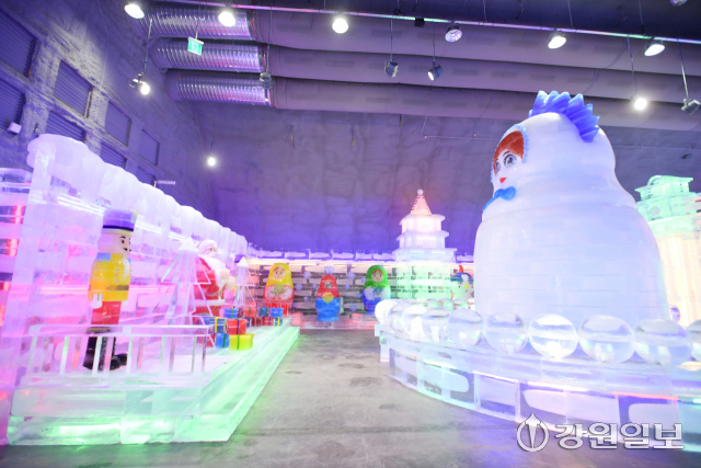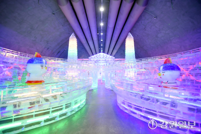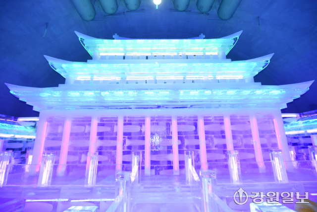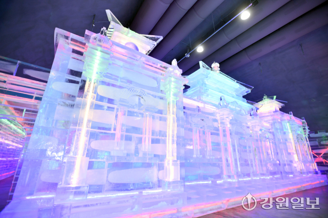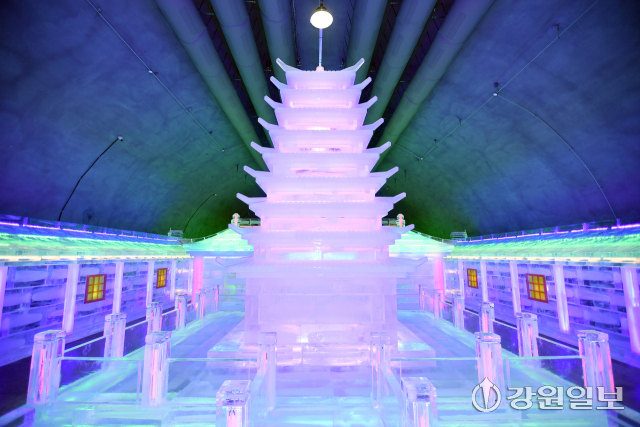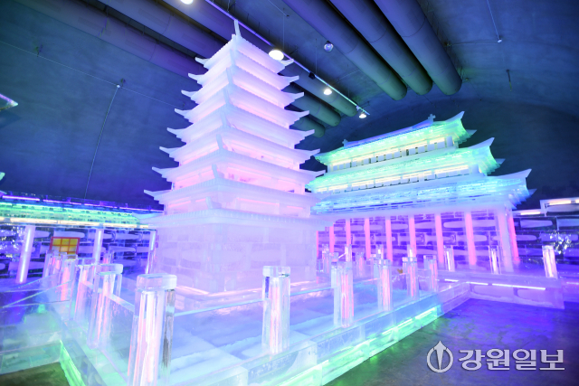 2026 얼음나라 화천산천어축제의 인기 프로그램 중 하나인 세계 최대 실내얼음조각광장이 20일 타빙식을 시작으로 운영에 들어갔다. 실내얼음조각광장에는 신라시대 황룡사지 9층 목탑을 비롯해 다양한 캐릭터와 세계 유명 건축물 조각 30여점이 전시된다.