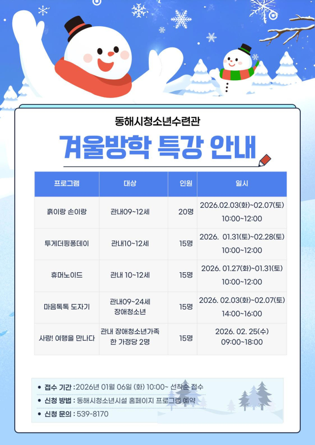동해시는 겨울방학을 맞아 청소년의 건강한 성장과 알찬 방학을 지원하기 위해 ‘Winter YouthLand’ 프로그램 참여 청소년을 모집한다.