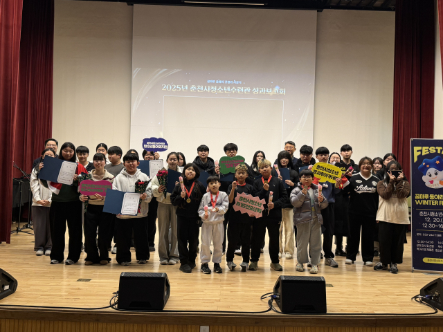춘천시청소년수련관(관장:이원영)은 지난 20일 수련관에서 2025년도 성과보고회를 개최했다. 이날 행사에는 수련관 소속 4개 자치 조직(청소년참여위원회∙청소년운영위원회∙청소년동아리연합회∙청소년봉사단)과 4개 활동단(청소년자기도전포상제∙청소년유해환경감시단∙경제금융교육 폴라리스+)이 참여했다. 춘천시청소년방과후아카데미에서 활동하는 100여명의 청소년도 참여해 지난 활동의 성과를 공유했다.