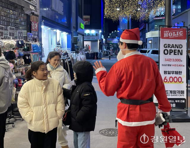 명동 입구에 들어서자 길을 걷던 많은 사람들의 눈길이 쏠렸다. 어떤이는 발걸음을 멈춰세우고 “메리 크리스마스”라며 인사를 건네기도 했다. 교복을 입은 중학생과 부모 손을 잡고 걷던 아이들 앞에서 인사를 건네자 선물을 향해 고사리 같은 손을 내미는 아이들의 얼굴엔 웃음이 가득했다. 그 순간 산타할아버지가 됐다는 사실이 비로소 실감났다.