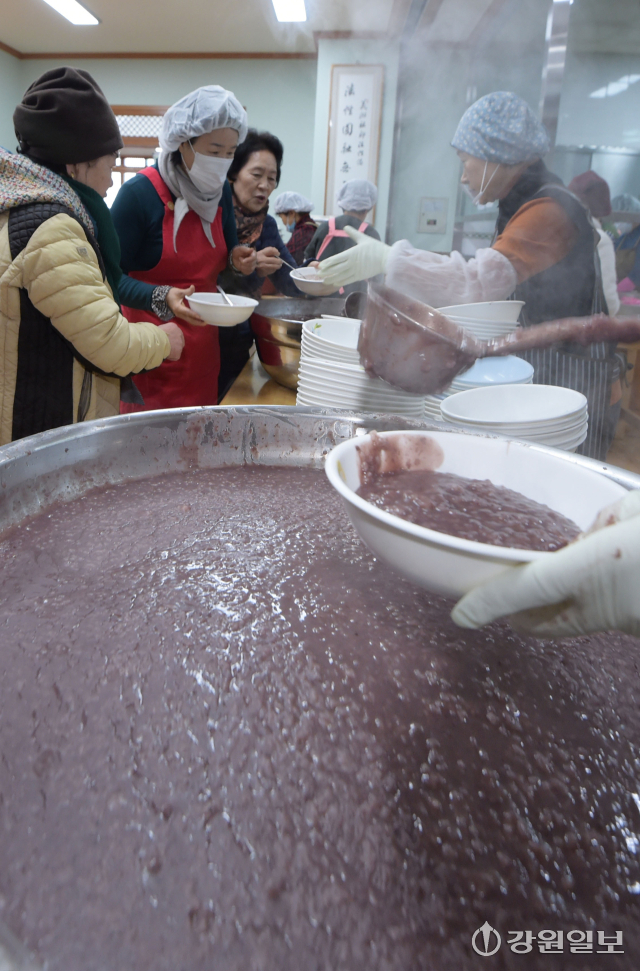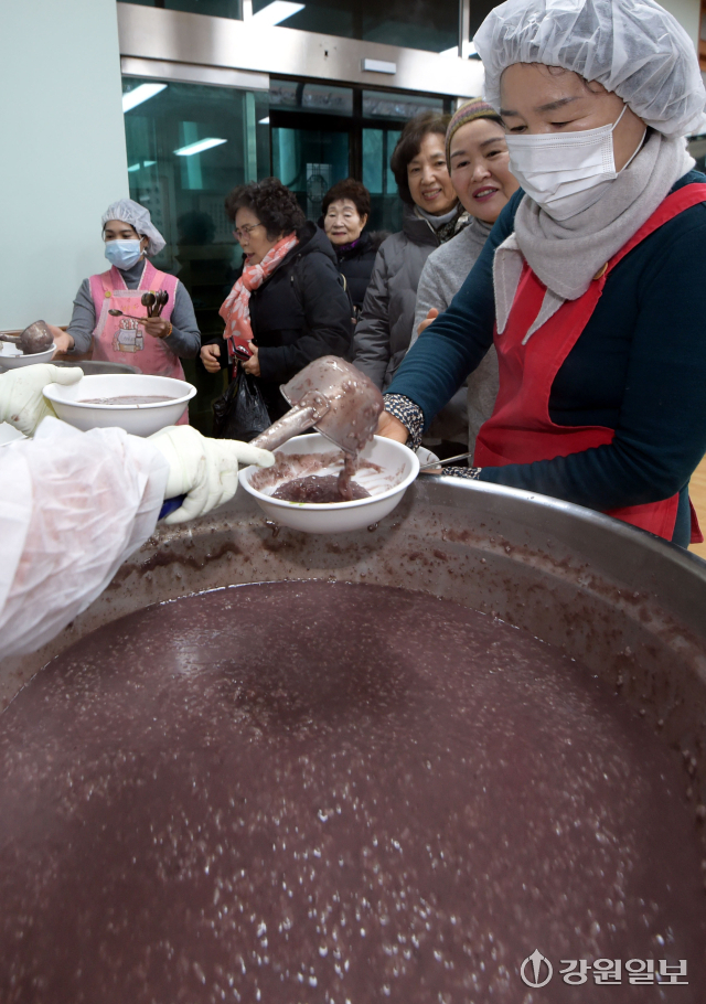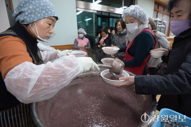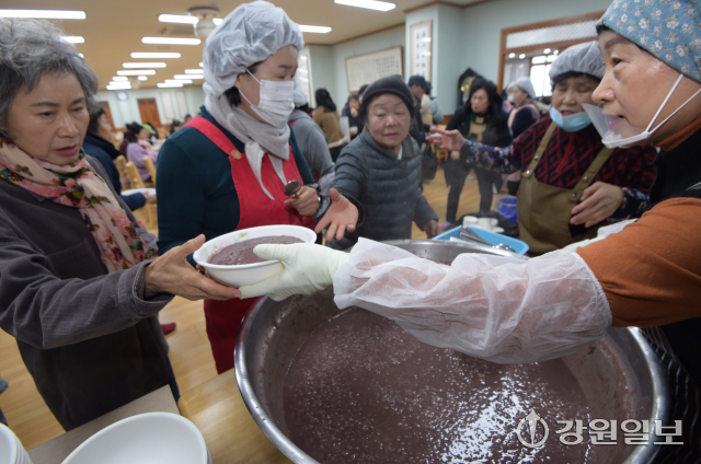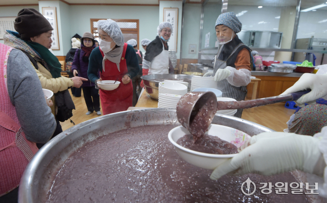 절기상 동지(冬至)인 22일 춘천 삼운사에서 신도들이 따끈한 팥죽을 나누며 액운을 쫓고 새해 건강을 기원하고 있다.