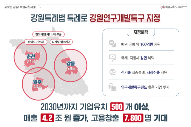 춘천의 경우 강원특별자치도 출범 및 특례 발굴 과정에서 연구개발특구를 처음 제안했고 이미 연구개발특구의 축소판인 강소연구개발특구로 지정돼있었다는 명분도 갖고 있다. 강원대·한림대를 중심으로 이공계 대학이 밀집해 있고 수도권 접근성도 우수해 한발 앞서있다는 평가가 나온다.