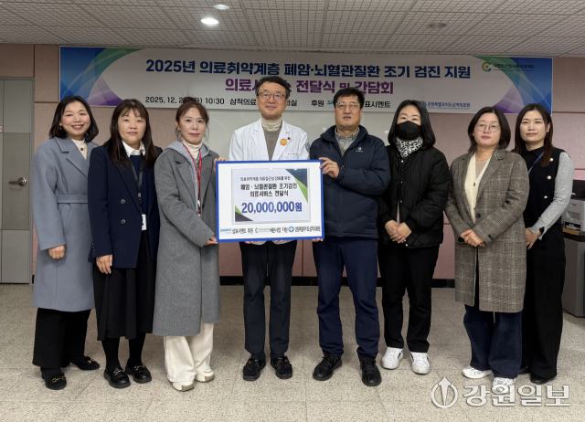 【삼척】삼척의료원이 23일 병원 회의실에서 권오선 삼척의료원장과 후원사인 ㈜삼표시멘트 임직원, 지역 8개 사회복지기관 관계자 등이 참석한 가운데 의료취약계층 폐암·뇌혈관질환 조기검진 지원사업 의료서비스 전달식을 가졌다.