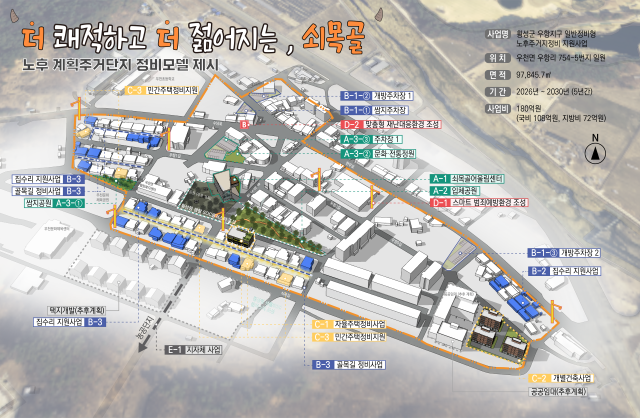 한편 우천면 쇠목골마을은 1993년 계획적으로 조성되어 도로와 가로망은 정비돼 있지만 건축물의 상당수가 30년 이상 경과해 노후화가 심각하다. 이에 이번 도시재생사업으로 노후계획주거단지의 특성을 반영한 정비모델을 제시함으로써 아파트 수준의 생활 SOC와 안전·편의 인프라를 갖춘 지속가능한 정주환경을 조성하게 된다. 특히 주민생활복지서비스 제공을 위한 거점공간 조성, 자율주택정비사업과 민간정비 지원, 골목길 정비사업을 통해 마을에 숨결을 불어넣어 대표 정주여건 개선 선도마을로 재탄생시킨다는 계획이다.