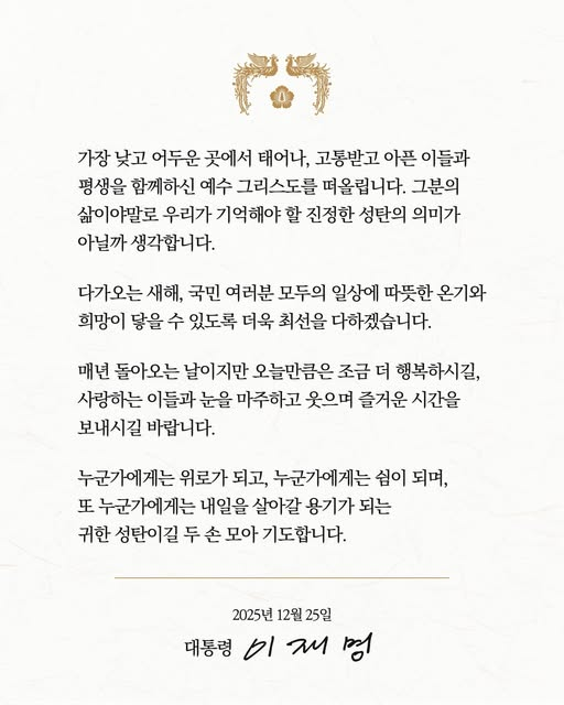 이재명 대통령은 성탄절인 25일 “새해를 앞두고 국민 한 분 한 분의 일상에 따뜻한 온기와 희망이 스며들 수 있도록 최선을 다하겠다”고 밝혔다.