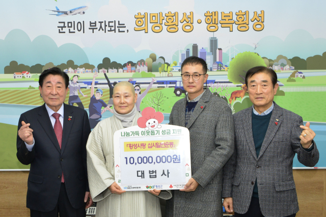 ◇횡성 대법사(주지:무영스님)·대규건설(대표:이상승)은 지난 24일 횡성군청을 방문해 '횡성사랑 십시일반운동'에 동참하며 성금 1,000만원과 쌀 10㎏짜리 80포를 기탁했다.