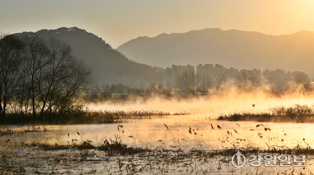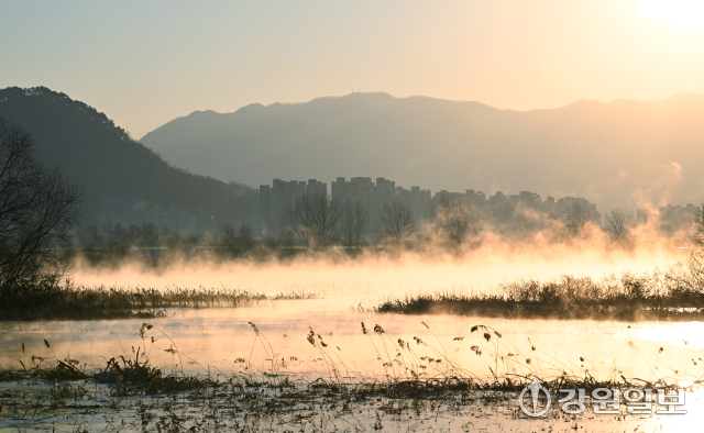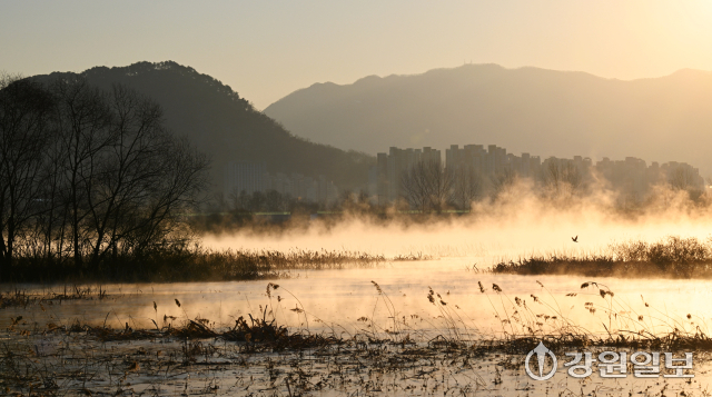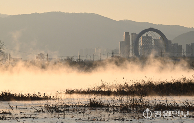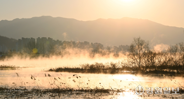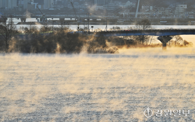 강원 산간, 내륙지방을 중심으로 아침 최저기온이 영하 15도 안팎으로 떨어지는 등 한파가 몰아친 26일 춘천 의암호에 수면의 온도차로 인한 물안개가 피어오르고 있다.