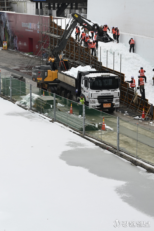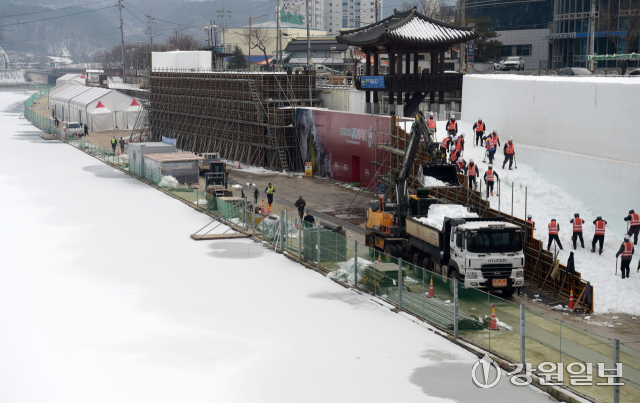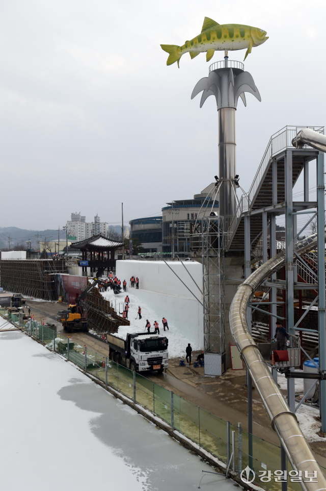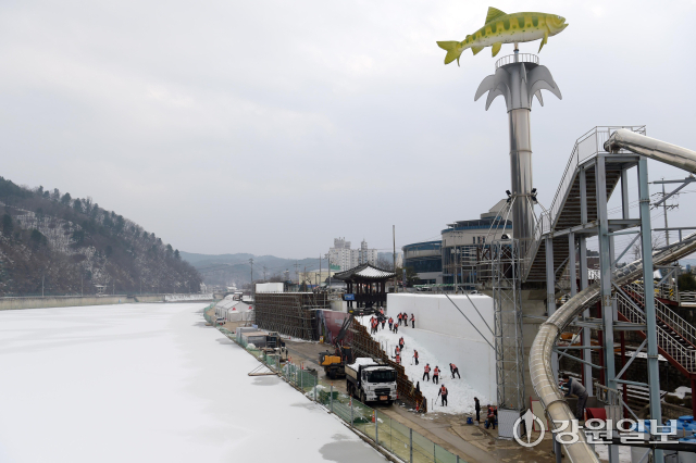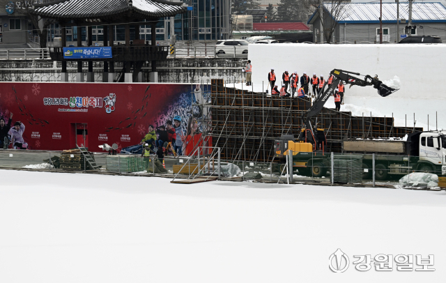 겨울축제를 준비하는 도내 지자체들마다 본격적으로 찾아온 겨울추위를 반기고 있다. 28일 꽁꽁 얼어붙은 화천천 주위로 내년 1월 10일 개막을 앞둔 국내 최대 겨울축제인 '2026얼음나라화천산천어축제' 준비작업이 한창이다.