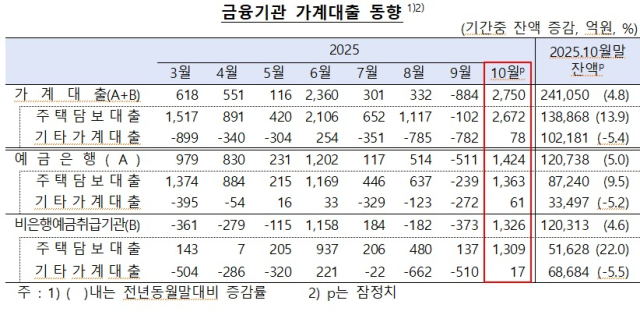 신규 아파트 입주가 시작되면서 9월 102억원이 줄었던 주택담보대출은 10월들어 2,672억원이나 늘어나 대출잔액이 13조 8,868억원으로, 전년 동월 대비 13.9% 상승했다. 주담대 잔액은 예금은행의 경우 한달 새 1,363억원이 증가한 8조7,240억원으로, 비은행예금취급기관은 1,309억원이 증가한 5조1,628억원으로, 전년 동월 대비 각각 9.5%, 22% 확대됐다.